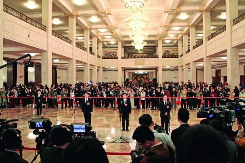 全国政协十四届四次会议第一场“委员通道”集体采访。摄影/本刊记者 郑茂典
