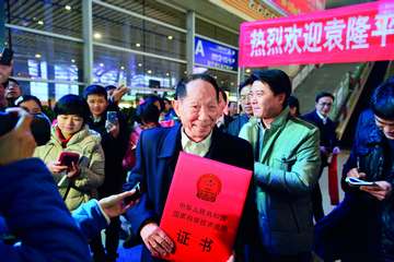 2014年1月11日,刚刚从北京参加完2013年度国家科学技术奖励大会的袁隆平从北京驶回的火车上走下来,《长沙日报》摄影记者陈飞捕捉到了这宝贵的一刻:袁隆平面带笑容,手里捧着那份沉甸甸的证书,站台上围满了前来迎接他凯旋的人,等待他载誉而归,恭贺他的“两系法”杂交水稻成果,摘取2013年国家科技进步特等奖的桂冠。