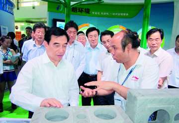 韩少杰董事长向北京市市长王安顺(前左)介绍公司产品