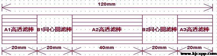 其中A、C、E为醋纤滤棒,B、D为中空滤棒,长度单位毫米。