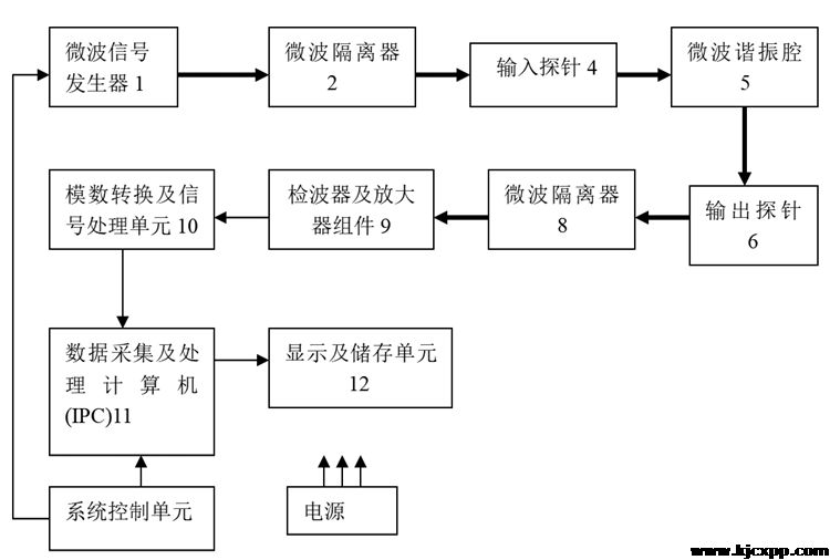 整个测试系统由微波谐振腔、微波信号产生器、微波信号隔离器、微波同轴传输电缆、微波信号检波及放大器组件、模数转换及信号处理单元、数据采集及处理计算机、系统控制单元、显示单元和电源等部分组成。(如图3)