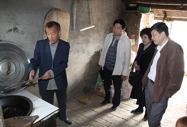 考察当地农民专家刘兴山(左)发明的“八位一体”太阳能房