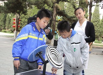 北京天文馆贾主任正在为参观者讲解光学原理形成的“看得见,摸不着”仪器