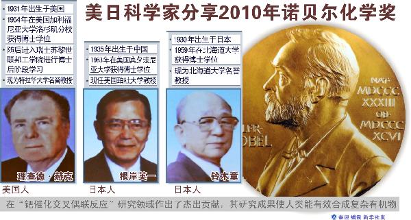 10月6日,瑞典皇家科学院宣布,授予一名美国科学家理查德·赫克和两名日本科学家根岸英一、铃木章诺贝尔化学奖,因他们在“钯催化交叉偶联反应”研究领域做出了杰出贡献。