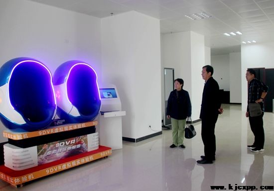 在听取“高科技产品展示厅”介绍后,沧州市科协副主席赵立权与《科技创新与品牌》杂志社社长宋文芳饶有兴趣地体验了VR战马与9DVR虚拟现实体验机。