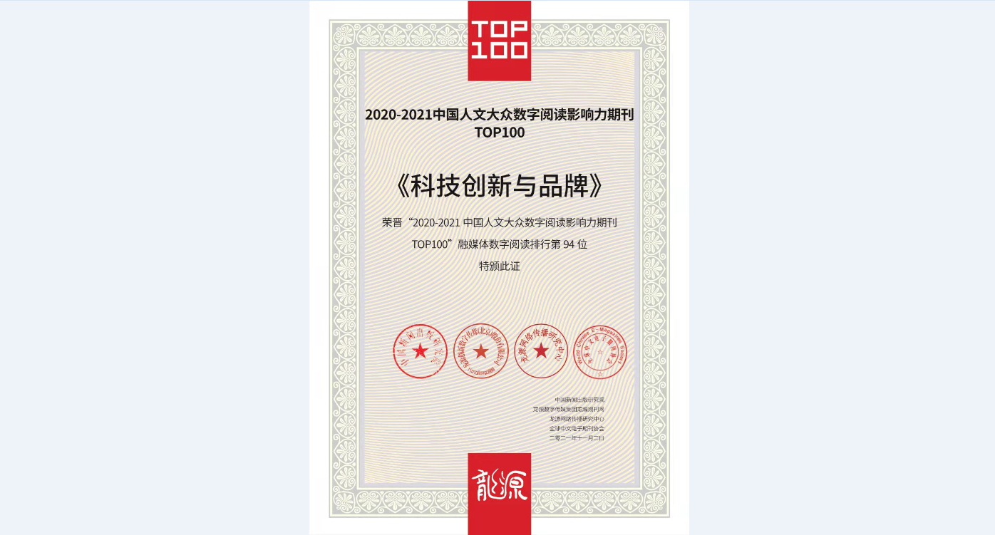《科技创新与品牌》荣晋“2020-2021中国人文大众数字阅读影响力期刊Top100”融媒体数字阅读排行第94位行业快讯 2021-11-10