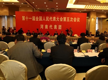 3月6日下午,出席十一届全国人大五次会议的河南代表团举行联组会议,讨论温总理所作的《政府工作报告》,并对中外媒体开放。联组会议由代表团团长、河南省委书记卢展工主持,代表团副团长郭庚茂等参加审议。 58家媒体的149名记者赶到河南大厦,聚焦河南代表团,聚焦中原经济区。卢展工连续第三年当“营销员”,向到会记者推销河南特产。