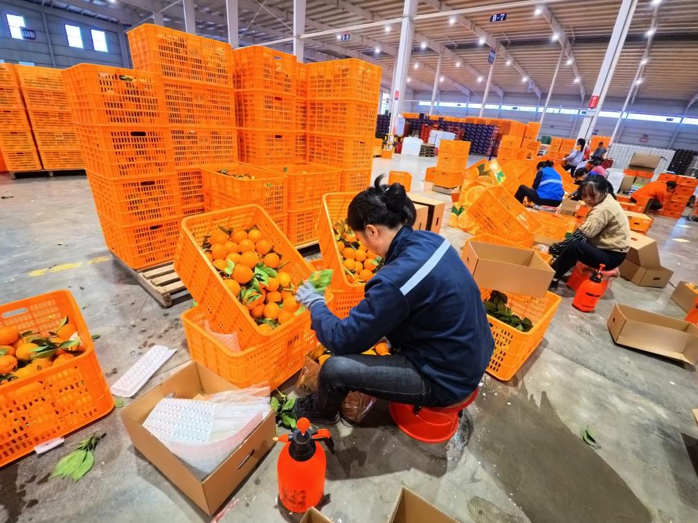 江西省赣州市于都县娜家农业有限公司打包车间内,工人们将分选出的脐橙分别装箱发货。新华社记者 陈浚武 摄