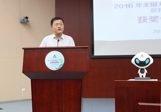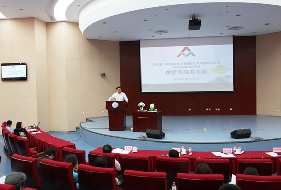 中国科协科学技术传播中心主任王进展介绍了双创活动周宣传品征集评审过程。征集工作是今年五月开始,由中国科协科学技术传播中心、共青团中央学校部共同发起,面向全国高校和社会公众开展了宣传品征集评审活动。清华大学、中国音乐学院、中国传媒大学、北京电影学院等四所院校分别负责吉祥物、主题歌、公益广告和微视频征集评审的组织工作。截至8月30日,共收到各类作品750件,其中主题歌311件,吉祥物102件,微视频121件,公益广告216件。9月初,受组委会委托,中国美术家协会动漫艺术委员会副主任吴冠英,中国音协原副主席、中央歌剧院原院长王世光,国家广告研究院院长丁俊杰、著名电影导演谢飞等四位专家分别担任吉祥物、主题歌、公益广告和微视频评委会主席。最终评选出一等奖3件,二等奖7件,三等奖22件,鼓励奖39件。活动周组委会经慎重研究,最终确定广东财经大学学生黄泽彬、江南大学学生杜棹洋共同创作的创特,东北大学学生张清钰创作的芽芽作为2016年大众创业万众创新活动周吉祥物,徐阡寒、郝永刚作词,郝永刚作曲的《创响中国》作为2016年大众创业万众创新活动周主题歌。