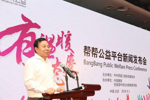 9月1日,在《中华人民共和国慈善法》正式施行当天,由中华思源工程扶贫基金会(以下简称“思源工程”)主办,中国搜索、中民社会救助研究院协办的帮帮公益平台上线新闻发布会在北京举行,全国政协副主席、民建中央常务副主席马培华,新华社原副社长兼常务副总编辑、中国搜索总裁周锡生,全国政协委员、中华思源工程扶贫基金会副理事长兼秘书长李晓林,民政部社会救助司原司长、中民社会救助研究院院长王治坤等领导出席活动并讲话。