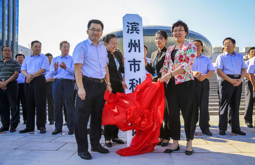 山东省科协副主席于洪文(左一)山东省滨州市副市长潘青(右一)为滨州市科技馆揭牌