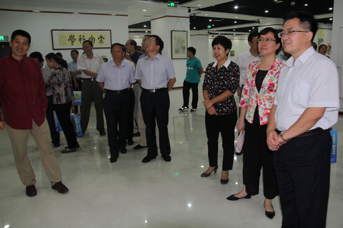 山东省科协副主席于洪文(右一)山东省滨州市副市长潘青(右二)滨州市科协主席赵敏静(右三)参观书画展览
