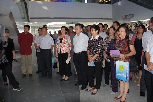 山东省科协副主席于洪文(中)山东省滨州市副市长潘青(左三)滨州市科协主席赵敏静(右二)参观科技馆