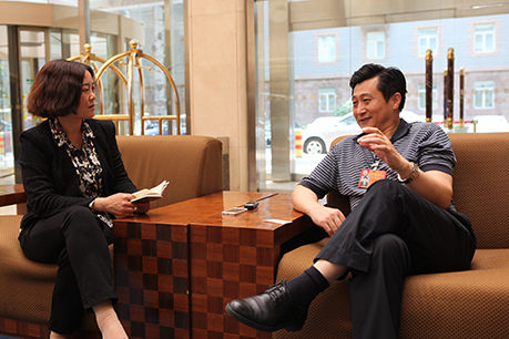 中国科协九大代表、山东省科协副主席纪洪波(右)接受本刊记者采访