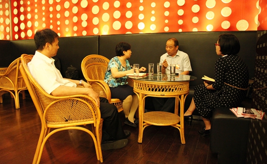 高元鸿(右二)接受本刊记者采访,(左一)天津市科协组织人事部部长侯建国