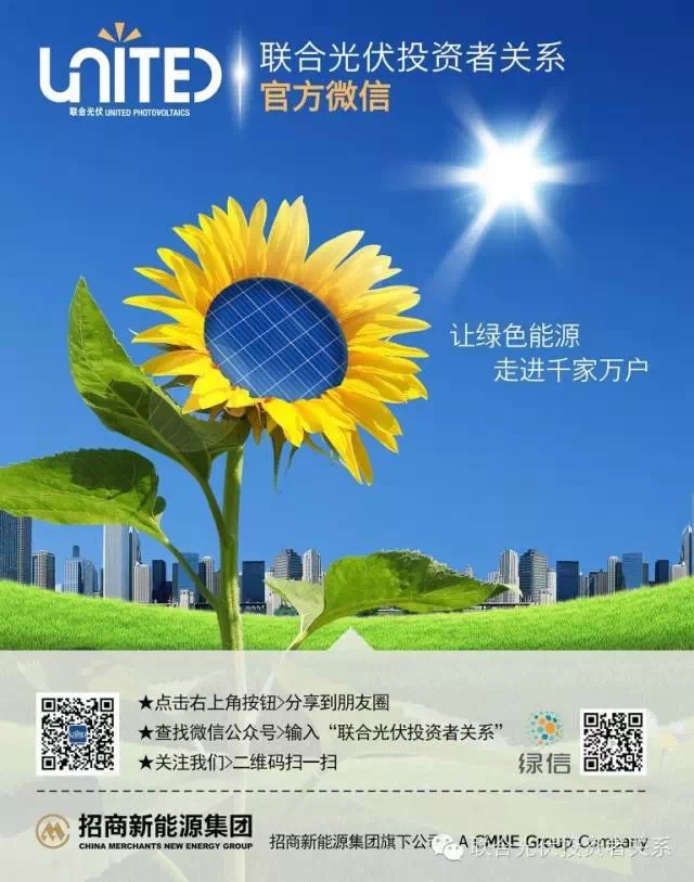 此次收购为本集团宣布收购海润光伏930兆瓦光伏电站项目之后的又一大收购举措。截至2015年7月30日,本集团拥有或正履行交收手续的光伏电站共计45个,遍布新疆、内蒙、青海、湖北、江苏、福建和广东等地,总装机容量将达到1.952吉瓦。 尽管当前中国经济依然面临下行压力,但是随着人们对环保问题的日益重视,以光伏为代表的清洁能源行业逆势上涨。据国家能源局数据,今年上半年,全国新增光伏发电装机容量773万千瓦,其中新增光伏电站装机容量669万千瓦。 联合光伏专注于快速增长的中国太阳能发电站市场,以投资优质发电站资产获得未来绿色能源的升值空间,并通过终端优势拉动包括原材料供应商、设备制造、系统集成、电力运营、信息服务等在内的节能减排产业链的迅速发展。