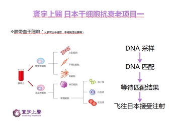项目一是脐带血干细胞抗衰老日本之旅,出发前先做DNA(HLA)检查根据HLA检查结果,如果有4组或以上合适使用的细胞,则可以在寰宇上醫咨询顾问的协助下安排去日本接受脐带血干细胞制剂注射,标准行程3晚4天;