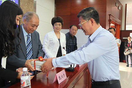 校长陈东军代表全校师生从戴汝为院士手中接过了赠书