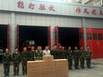 中建二局东北分公司第二十一项目经理部书记董波向消防官兵发放物品