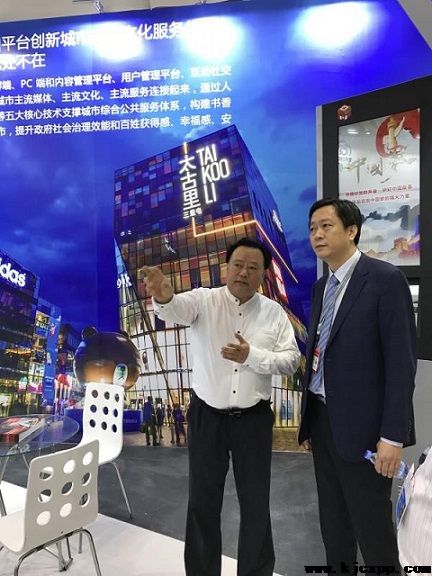 北京市委常委、宣传部部长杜飞进(图右)参观龙源展区,了解数字大屏产品