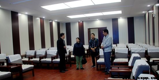 参观学术交流厅,沧州市科协副主席赵立权(左一)向《科技创新与品牌》杂志社社长宋文芳(左二)介绍“科技工作者之家”首次学术活动情况,(右一)沧州市科协科技工作者服务中心主任张法铭,(右二)沧州市科协办公室主任刘强
