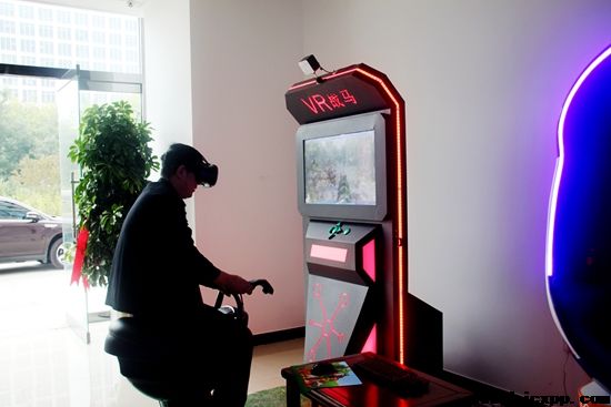 在听取“高科技产品展示厅”介绍后,沧州市科协副主席赵立权与《科技创新与品牌》杂志社社长宋文芳饶有兴趣地体验了VR战马与9DVR虚拟现实体验机。