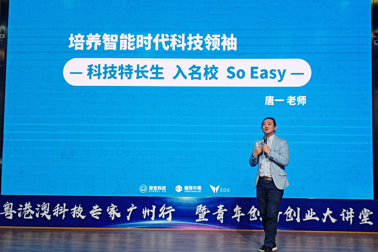 澳门青年创业者、广州奇宝教育科技有限公司创始人唐一以“培养智能时代科技领袖”为主题,分享了自己专注儿童编程教育的初衷和愿景。创业前的唐一是一名大学教师,编写过9本有关Flash Photoshop的电子教科书,参与过上百集的长篇动画的制作,带领团队开发了500多个幼教App,也担任着澳门科技教育委员会主任、香港人工智能学会科技教育主席职务。来到广州后,带领团队全力打造“编程中国” 学习社群,教孩子们学习“编程+3D工艺+电子工程”,帮助他们适应人工智能的工业4.0时代,使孩子拥有更强的创造力和动手能力,“希望通过发现和培养科技特长生,普及新一代儿童科技基础教育,推动科技强国。