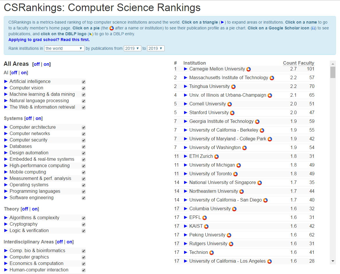 2019年度CSrankings全球计算机科学专业排名AI领域榜