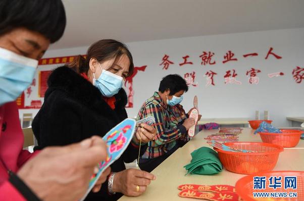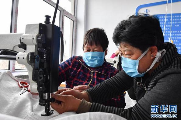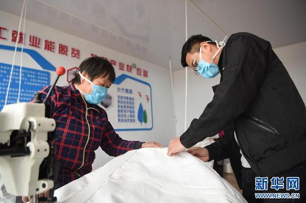 4月15日,在丰镇市十里库联村扶贫车间,村民在制作吨包袋。 近日,在内蒙古乌兰察布市丰镇市的扶贫车间,村民们在做好疫情防控的同时,抓紧时间生产。目前,丰镇市已建立传统手工、来料加工等多类扶贫车间,吸收贫困户就业,帮助贫困户增收。 新华社发(李志鹏 摄)