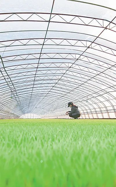 在黑龙江农垦红兴隆管理局友谊农场第四管理区一处水稻育秧基地,农户们采用电动播种机、覆土机实现机械化播种。图为4月18日,农户在查看育秧大棚内温度计读数。 刘帅冶摄(影像中国)