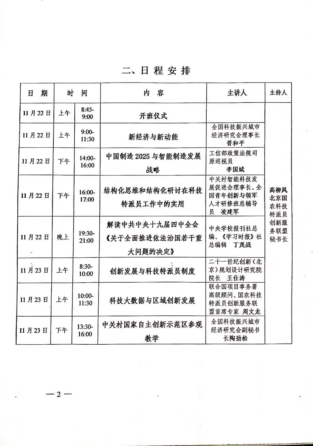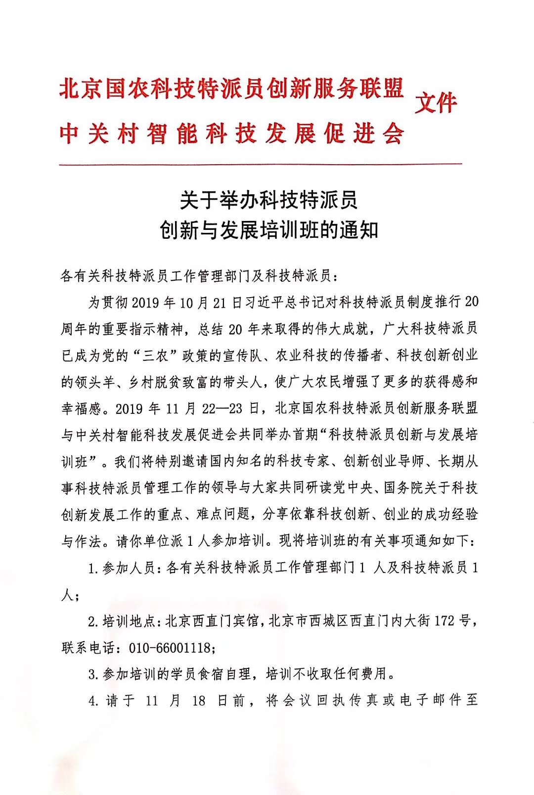 为贯彻2019年10月21日习近平总书记对科技特派员制度推行20周年的重要指示精神,总结20年来取得的伟大成就,广大科技特派员已成为党的“三农”政策的宣传队、农业科技的传播者、科技创新创业的领头羊、乡村脱贫致富的带头人,使广大农民增强了更多的获得感和幸福感。2019年11月22—23日,全国科技振兴城市经济研究会与北京国农科技特派员创新服务联盟共同举办首期“科技特派员创新与发展培训班”。我们将特别邀请国内知名的科技专家、创新创业导师、长期从事科技特派员管理工作的领导与大家研读党中央、国务院关于科技创新发展工作的重点、难点问题,分享依靠科技创新、创业的成功经验与作法。请你单位派1人参加培训。现将培训班的有关事项通知如下: