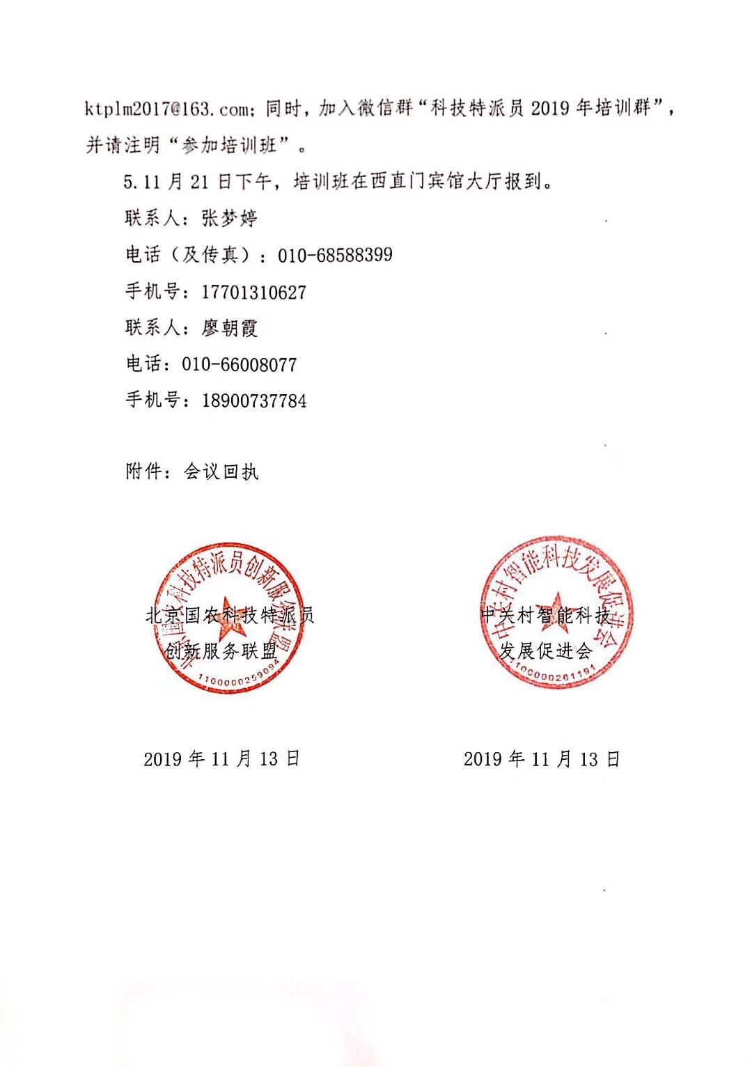 4.请于11月18日前,将会议回执传真或电子邮件至北京国农科技特派员创新服务联盟,同时加入微信群“科技特派员2019年培训群”,加入微信群时请注明“参加培训班”。