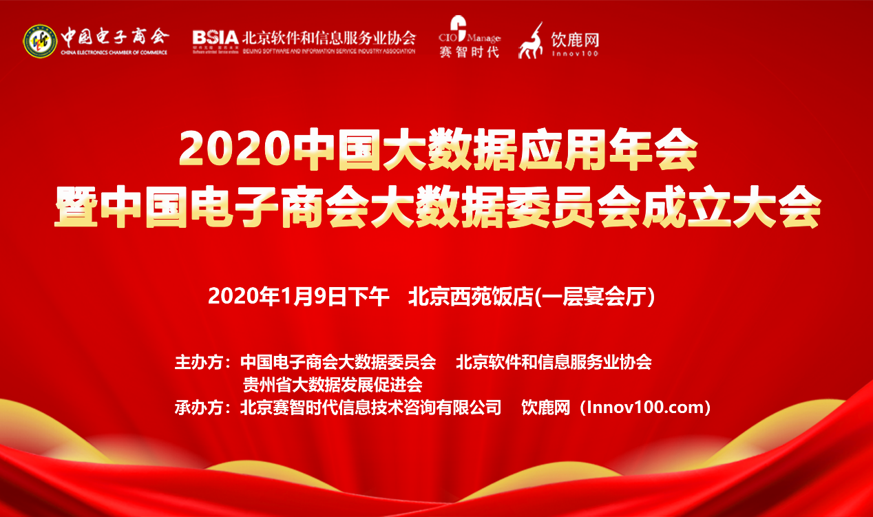 在此背景之下,由中国电子商会大数据委员会、北京软件和信息服务业协会、贵州省大数据发展促进会主办,北京赛智时代信息技术咨询有限公司、饮鹿网(Innov100.com)承办的2020中国大数据应用年会暨中国电子商会大数据委员会成立大会,将于2020年1月9日下午北京西苑饭店(一层宴会厅)举办。