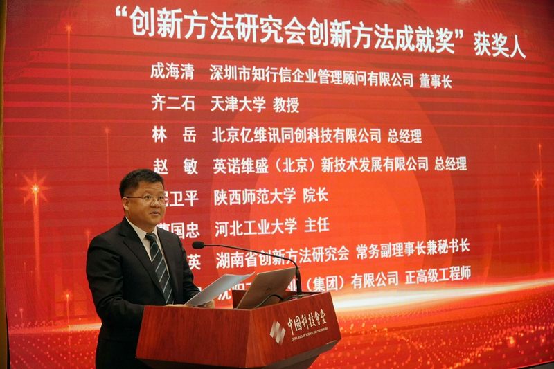 论坛对为创新方法工作做出卓越贡献的杰出个人和创新案例进行了表彰。创新方法研究会秘书长陈其针宣读了“创新方法研究会创新方法成就奖”获奖名单,成海清、齐二石、林岳、赵敏、胡卫平、曹国忠、彭英、景智等八位个人及“浙江省创新方法推广应用体系的构建与应用”“面向非常规油气资源开发工程的创新方法集成研究及示范”等项目获此殊荣。