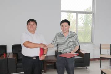 山东省滨州市畜牧兽医研究院院长沈志强(右)与龙瑞牧业有限公司总经理潘卫东(左)交换合作意向书