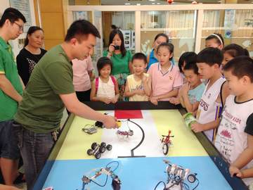 青少年科技辅导员带领外来务工子女进行电脑机器人组装体验