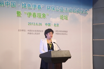 甄砚副主席在致辞中说:全国妇联历来高度重视妇女环保工作,指导各级妇联开展了各种主题鲜明的绿色行动,动员广大妇女和家庭在生态文明建设中发挥应有的作用。她还表示,伊春素有祖国林都的美誉,自然环境美丽,绿色资源丰富,生态产品得天独厚。这次能够与伊春市委、市政府共同举办“美丽中国·绿色伊春”的环保公益活动,既是中国妇女发展基金会继续着力于妇女与环保公益项目的具体体现,也是伊春市在生态文明建设方面的一次生动展示。