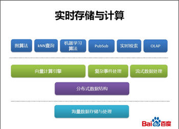 “百度不仅建立了统一的分布式存储系统,可支持上百PB数据处理量的分布式计算系统,还拥有先进的实时存储与计算系统。”林仕鼎详细介绍了实时存储与计算系统的架构,“我们在底层建立分布式的数据结构,在这一基础上开放接口,建立和处理相关的引擎,如向量计算引擎、流式计算引擎等,以实现大规模向量、矩阵、复杂文件等的处理。在这些处理引擎之上,我们可以建立图算法、机器学习算法等,实现不同类型应用的实时存储与计算。”