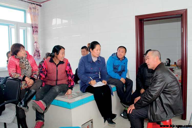 王艳凤(前左三)在家访中认真听取村民的想法