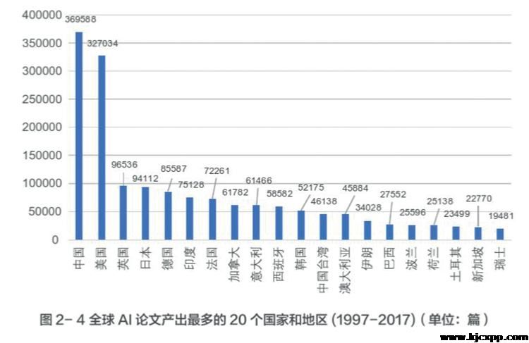 全球AI论文产出最多的20个国家和地区(单位:篇)