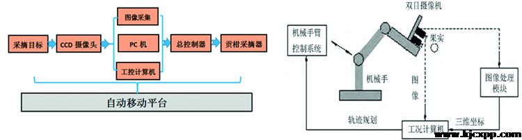 定位系统和果实识别的硬件主要由1394转换卡、单目摄像机和主控制器组成。先由摄像机采集果树图像,然后通转换卡将采集到的果树图像传输到主控制器,在主控制器中采用各种图像处理算法对果树图像进行处理,从而识别出成熟的果实,解算出果实在机械臂基坐标系下的三维坐标。