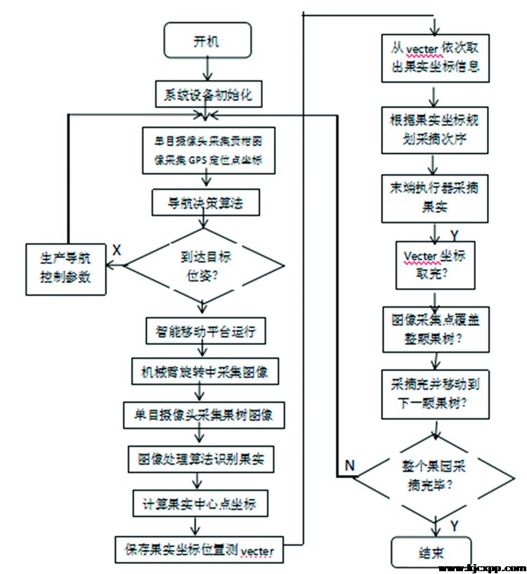 采摘机器人控制系统软件设计简述如下:(1)系统设备初始化。(2)主控制器首先通过1394转接卡采集单目摄像机所拍摄的路面图像,通过RS232采集GPS航向信息及位置坐标。然后主控制器对导航图像进行处理,并提取视觉导航参数。最后主控制器再根据GPS采集位置和航向信息以及坐标导航图像信息进行决策分析,进而实现移动平台的自主导航。(3)主控制器通过1394转接卡采集单目摄像机拍摄的果树图像,对成熟果实进行识别与定位。并将摄像机坐标系下目标果实的三维坐标转换到采摘机械臂的基坐标系下。再由主控制器根据果实位置坐标对机械臂采摘路径进行规划。(4)当机械臂运动到目标姿位后,主控制器通过RS232向末端执行控制器发出指令,于是末端执行器抓取果实。(5)重复以上四个步骤直到机械臂采摘范围内的果实采摘完毕。(6)机械臂回到导航的初始位姿,并重复以上自主导航和自主采摘过程。