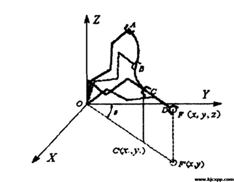 上图所示,XYZ为机械臂的基坐标系,O为坐标原点,F为果实中心,F’为果实中心在XOY面内的投影。A、B、C、D分别为采摘机械臂处于不同位姿时其末端执行器的对称中心点。因为图像采集位姿在采摘之前就已经给定了,所以B点的坐标是已知的,D点的坐标可由双目视觉系统求得,故要完成整个路径规划,必须求出C点的坐标,设C点与D点之间的距离为L,试验中确定L的长度为0.5m,由以上已知条件可求得C点的坐标。