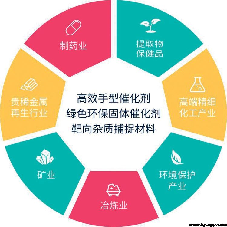 金之键的产品功能性配位新材料不但可以高效地将溶液中金属离子降低到ppb级别,而且不会带入新的杂质,更不会造成药物中间体的损失。此种新材料是将有机功能团以共价键的方式与硅胶键形成一个无机与有机的完美结合体。 特定的功能团能够在溶液中对某种或某些重金属进行高选择性、高稳定性、高靶向性的捕捉,并且靶向捕捉能力可以将金属含量降低到1ppm甚至0.1 ppm以下。因为此类产品有很强的捕捉金属能力,近年来此类功能性材料在贵金属回收行业也越来越活跃,尤其在制药、提取物、精细化工以及贵金属矿业等行业颇受欢迎。