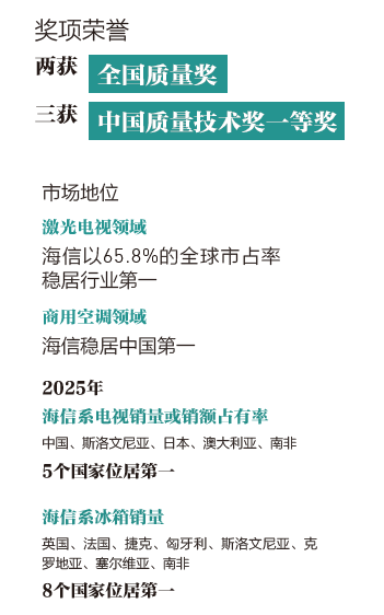 对品质的极致追求,使海信产品在全球市场广受欢迎。截至2025年末,海信100英寸电视出货份额连续3年位居全球第一,在中国、南非、日本等5个地区市场占有率排名第一;冰箱在英国、加拿大等7个国家销量排名领先;商用空调稳居国内多联机市场首位。海信两度荣获全国质量奖、三度荣获中国质量技术奖一等奖。