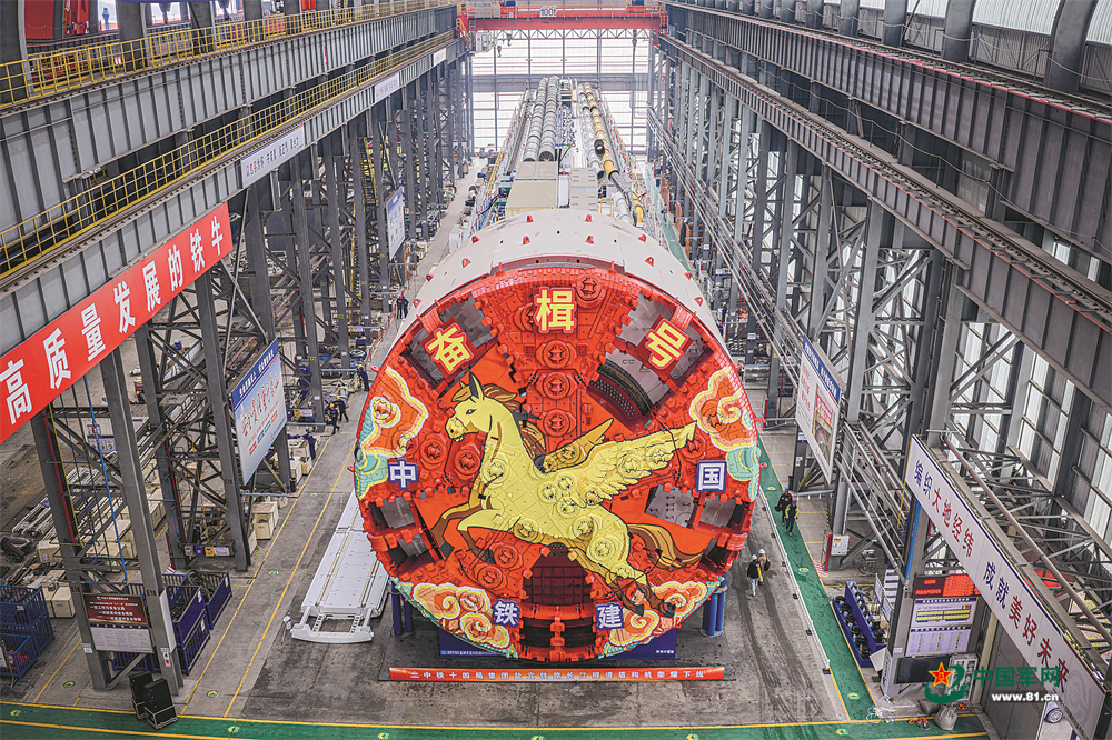 由中国铁建打造的一台国产14米级超大直径盾构机“奋楫号”顺利下线,将被用于新建高铁长江隧道工程。新华社发