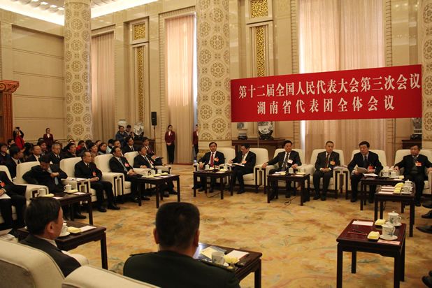 3月5日下午,出席十二届全国人大三次会议的湖南代表团在人民大会堂湖南厅举行第二次全体会议,审议政府工作报告。根据大会安排,此次会议向 中外媒体开放。中外媒体云集湖南代表团审议会场,报道盛况空前。