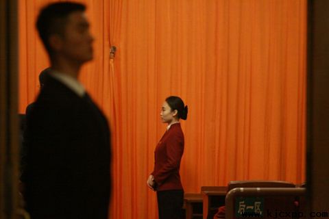 全国政协十二届五次会议现场,安保人员和服务人员肃然伫立,他们的辛苦付出保障了会议的顺利召开。