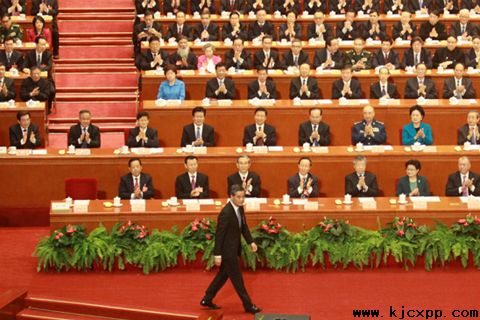 全国政协十二届五次会议增选梁振英为政协第十二届全国委员会副主席,他登上主席台就坐。