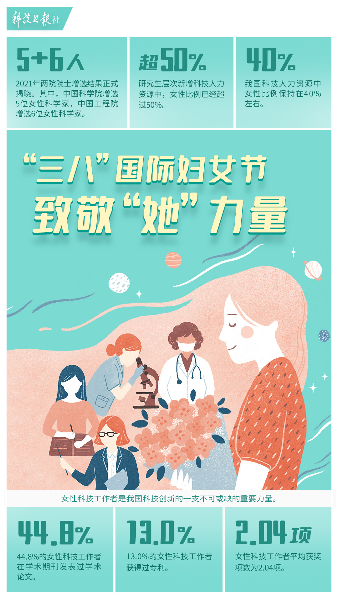 “三八”国际劳动妇女节,全称“联合国妇女权益和国际和平日”。我们在这一天,庆祝女性在经济、政治、社会等各个领域做出的重要贡献和取得的巨大成就。女性科技人才是科技人才队伍的重要组成部分,也是我国科技事业十分重要的力量。我国女性科技工作者,正在以独特的视角与思维方式,彰显巾帼风采,推动科技的创新、进步与发展。世界需要科学,科学需要女性。今天,致敬“她”力量!